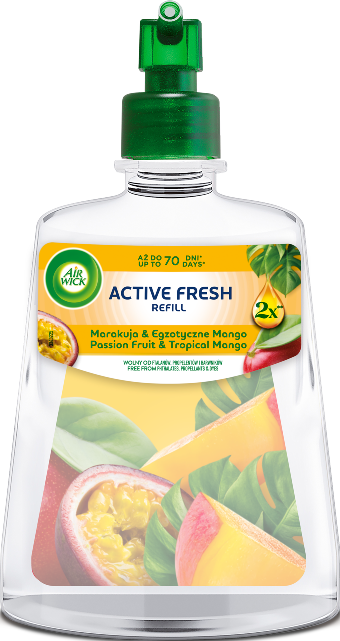 Air Wick 24/7 Active Fresh Marakuja & Egzotyczne Mango Wkład 228ml to refill dla osób, które korzystają już z automatycznego sprayu Air Wick i chcą utrzymać w domu bardziej soczysty, tropikalny charakter zapachu. Taki wariant dobrze sprawdza się tam, gdzie chcesz dodać wnętrzu trochę energii i bardziej żywego klimatu bez ręcznego odświeżania kilka razy dziennie.
